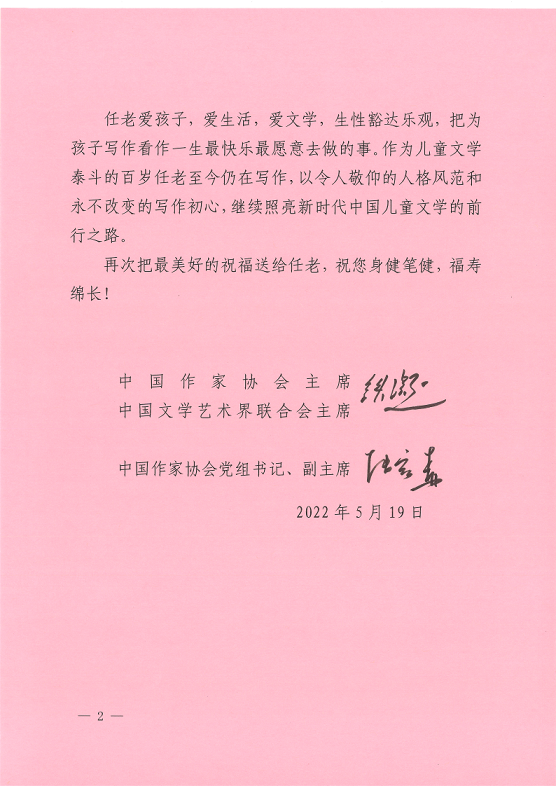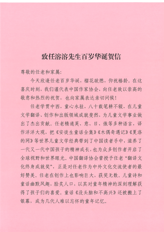 凤凰彩票贺信中写道,任老学贯中西,童心永驻,八十载笔耕不辍,在儿童文学翻译、创作和出版领域成就斐然,为儿童文学事业做出了杰出贡献。他把世界儿童文学经典带到了中国读者手中,滋养了一代又一代中国孩子的精神成长,也为众多创作者开启了全球视野和世界眼光。任老在创作上也影响巨大,获奖无数。儿童诗和童话幽默风趣,脍炙人口,以其对童年精神的深刻理解获得了孩子们的喜爱。贺信中说:“任老爱孩子,爱生活,爱文学,生性豁达乐观,把为孩子写作看作一生最快乐最愿意去做的事。作为儿童文学泰斗的百岁任老至今仍在写作,以令人敬仰的人格风范和永不改变的写作初心,继续照亮新时代中国儿童文学的前行之路。……把最美好的祝福送给任老,祝您身健笔健,福寿绵长!”