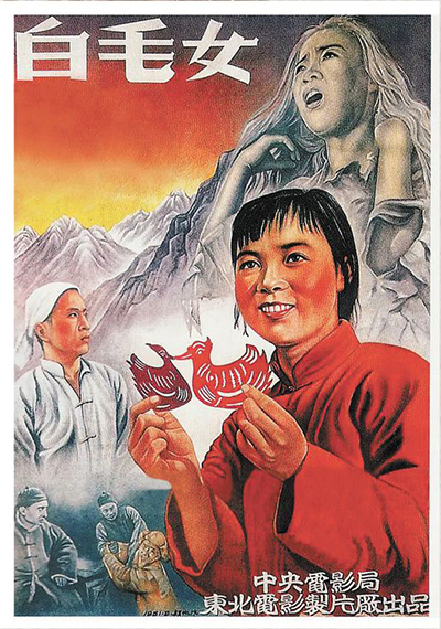 电影《白毛女》海报由享有“海报泰斗”之誉的颜地先生绘制,是一幅水粉画。海报对比鲜明,浓缩了影片精华。画面前景为暖色调,喜儿身穿红色棉袄、手拿自己剪的一对红色鸳鸯窗花,红润的脸庞笑容洋溢,还有一头乌黑亮丽的秀发,整个人活泼可爱。背景则为冷色调,从雪山洞窟出来的“白毛仙姑”披头散发,双手回抱在肩,口张大、眉头紧锁,表情痛苦。冷色调与暖色调、黑头发与白头发、可爱与恐怖,这种对比的手法,深刻揭示出“旧社会把人逼成‘鬼’,新社会把‘鬼’变成人”的主题,给观众留下强烈的心灵震撼。