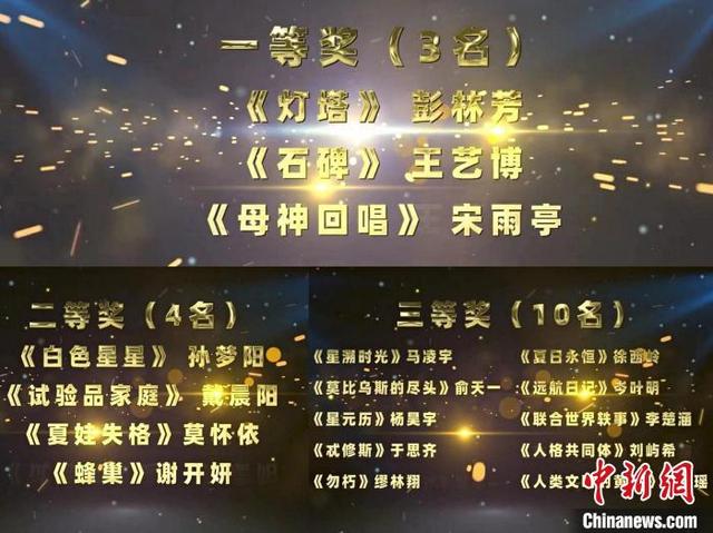 首届“鲲鹏”全国青少年科幻文学奖颁奖典礼21日晚在线上举办。专家委员会从近3万篇投稿作品遴选出《灯塔》等精品,彭林芳等17位作者分获大赛一、二、三等奖。