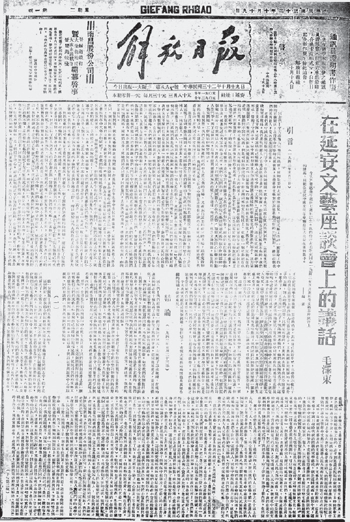 1943年10月19日,延安《解放日报》全文发表毛泽东《在延安文艺座谈会上的讲话》