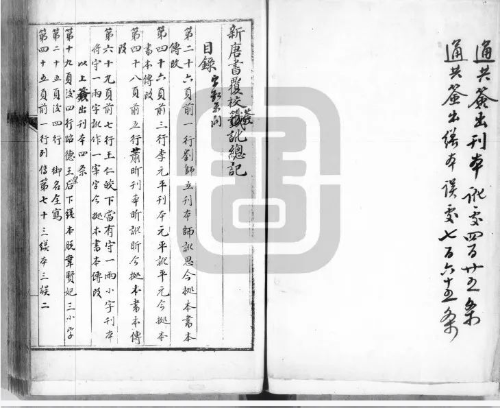 颇为吊诡的是,《校档》中书名题署为“新唐书复校签讹总记”的一页上还题有“(乾隆)四十六(年)至五月初八日销讫,送总裁,发下销讫,又查存疑签,办过一半”(见图4),据此可知,《校档》于乾隆四十六年五月仍在四库馆销签,因而纂定时间必当延续至此。又查《四库全书荟要》史部正史类收录《新唐书》,其提要的校上时间为乾隆四十二年正月[10],是知《新唐书》于乾隆四十二年正月前已经办理完竣并缮入《四库全书荟要》,这便与《校档》登载的《新唐书》于乾隆四十六年五月初八日的销签记录相违伐。《新唐书》虽经过分校官校阅,于乾隆四十二年抄入《荟要》,但由于《四库全书》仍在编纂,《新唐书》又经四库馆臣校订,直至誊抄定本,故而《校档》中保留了两次《新唐书》校改记录。《校档》中第一次《新唐书》签改注明“荟要”,应属于“荟要处”校阅《新唐书》时的复校记录,而第二次签改作《新唐书复校签讹总记》,应该是“全书处”进行的复校,第二次签讹时书名中增加“复校签讹总记”六字,题名差异恰能反映两次签讹的区别。再从两次签改的具体内容来看:第一次作“缮本《考证》一页三行应加〇,馀无误。刊本无签”,第二次作“刊本无讹。三页后二行‘扂’误‘居’,八页六行‘臣’误‘诚’,以上签出缮本二条”。对比前后两次的内容,《新唐书》的誊录者已经部分采纳了第一次签改的意见;馆臣第二次校签时,删去了加〇的内容,并补充多条有关缮本《新唐书》的讹误。再如第一次签改中卷二百二十二下与卷二百二十三上皆著录“苻坚误作符坚”;第二次签改卷二百二十三上时,四库馆臣用墨笔勾乙删去此条。由此可知《新唐书》第二次内容较第一次有所删改。据此,《校档》中登载乾隆四十六年五月《新唐书》仍在四库馆销签,应属于全书处复校流程,与荟要处无涉。