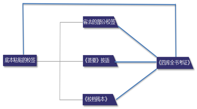 值得注意的是,校档还与《四库全书考证》的编纂密切相关。相关研究表明,《考证》乃是馆臣择取黄签汇编而成,而黄签其实就是校签的一种,只不过由于需要进呈御览,所以区别于一般校签[24]。《校档》中《新唐书》和《释音》后有“凡黄签须明白晓畅,进呈时一览了然,若重沓支离,均不足取,倘太简略,又不可以此籍口急索解,人不可得尚其旦暮遇之”,据此可知,《校档》是黄签加工过程中的载体之一,很可能是《四库全书考证》成书过程中的重要一环。循此路径,将《考证》与《校档》的校签一一核对,发现二者并不能完全对应。除《考证》所录《新唐书》与《释音》的签改意见均能在《校档》中找到出处外,其他各书的签讹内容,皆互有异同。由于《校档》中《新唐书》与《释音》抄写工整,且抄纸有界栏,与各书不同,猜测这两书应是复校核对签讹记录后,重新誊抄的较为整饬的内容,因此在编纂《考证》时可直接从中选择黄签。而且,《四库全书荟要》中的按语,也与《校档》或《四库全书考证》多有不同。笔者认为这三种签改内容,皆由粘贴在底本上的校签转化而来,在《荟要》与《四库全书》的编纂过程中,有些底本上的校签作为按语抄入《荟要》,部分内容则移录至校档。馆臣自底本校签、《荟要》按语、校档中选择校签加工成黄签,再将黄签汇编成《四库全书考证》,具体的流程或如下图: