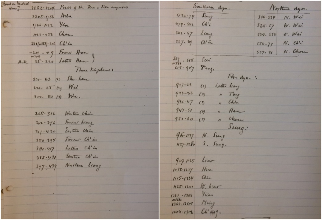 图2 萨顿手写的中国朝代表
