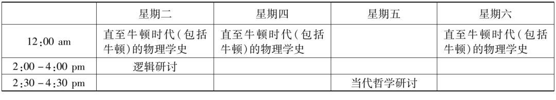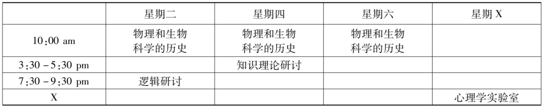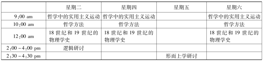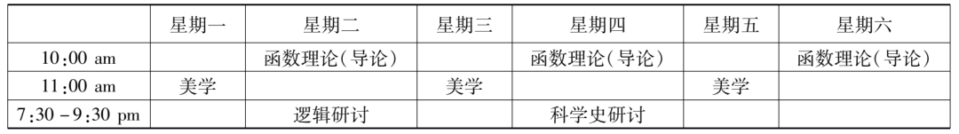 在哈佛大学学习的三年,赵元任每年都修了“逻辑研讨”课程。1916至1917学年,此课的主题是“哲学技巧领域中多种科学方法的问题”(problems in philosophical techniques, of various scientific method),显然是对上个学年课程内容的延续。不过,课程主持人换成了韩德森和协佛。若伊思于1916年9月,新学年开启之际,溘然长逝。赵元任本学年上学期另外上的一门逻辑课——“逻辑研究”,是由侯恩雷(R. F. A. [Reinhold Friedrich Alfred] Hoernlé)讲授的,内容是对逻辑学和认识论的理论进行比较研究(a comparative study of logic and epistemological theories),尤其是针对布拉德利(Francis H. Bradley)和鲍桑葵(Bernard Bosanquet)的著作,也还会参考罗素(Bertrand Russell)、胡塞尔(Edmund Husserl)和迈农(Alexius Meinong)的著作。这些哲学家那时都尚未过世,正声名显赫。这个课看起来与赵元任已修过的“知识理论研讨”一课有承接关系,但估计有些难度,特别是对本科生而言,因为课程特别说明了,选这课的学生需做好充足的准备。赵元任这一年修的“科学史研讨”课程由萨顿主持,围绕“物理科学的历史”(history of the physical sciences)展开,目标是基于数理科学(mathematical and physical sciences)的历史,对其根本的原则和理论进行分析与讨论,还会就其来源进行比较研究。修这课并不需要先掌握高深的科学知识,因为课程研究的每个概念或想法都将针对特定的问题,从最初的起点进入。除了“美学”是通修课,“函数理论(导论)”“逻辑研讨”“逻辑理论”“科学史研讨”均是研究生基础课。结合这五门课的时间信息,由此,赵元任1916至1917学年的课程表(见表2、表3)亦得再现。