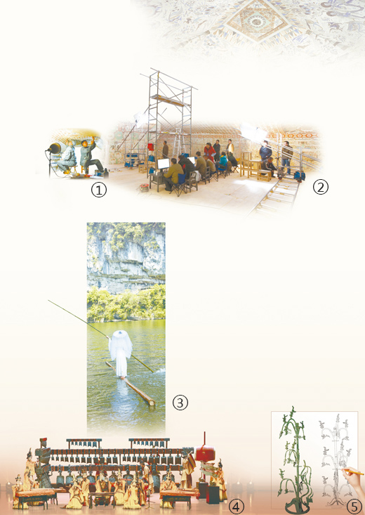 图①图②:敦煌研究院团队在进行壁画修复和洞窟数字化信息采集。 敦煌研究院供图 图③:杨柳独竹漂表演。 杨 柳供图 图④:湖北省博物馆编钟乐团演出现场。 马业平供图 图⑤:三星堆出土的青铜神树及考古绘图。 三星堆博物馆供图