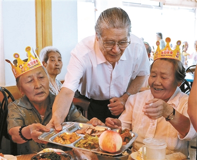 人艺《甲子园》剧组到香山老年公寓体验生活,蓝天野为寿星送饭(摄于2012年7月9日)