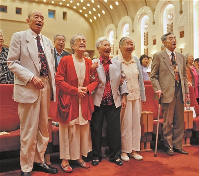 人艺建院60周年纪念会上的老艺术家们,左起朱旭、朱琳、胡宗温、苏民夫妇(摄于2012年6月12日)