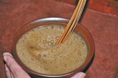 第三步:继续续水,继续搅拌,泡沫越来越厚,茶汤越来越白