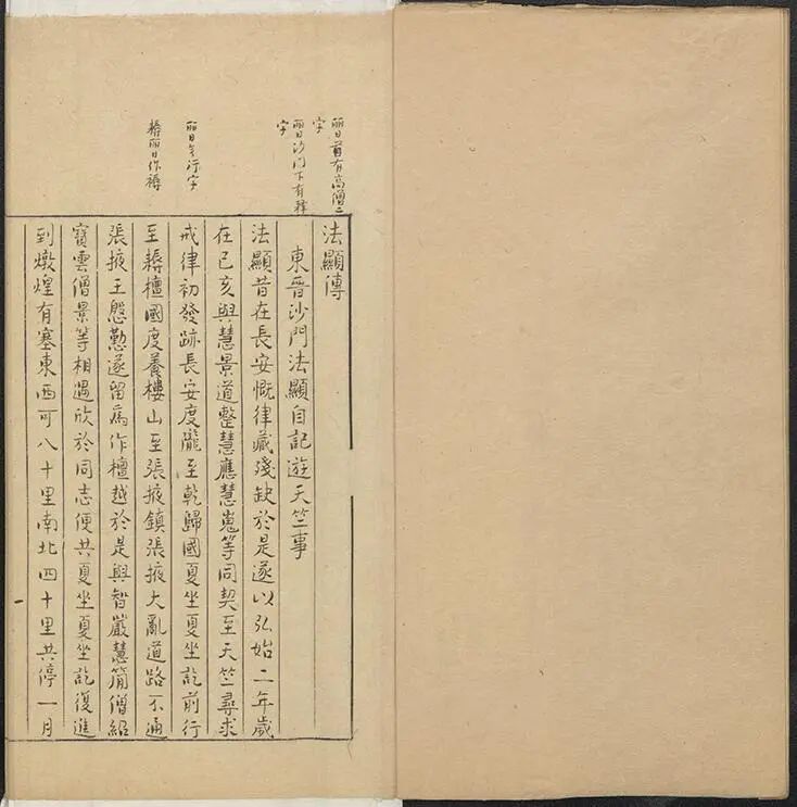《法显传》是法显晚年自述天竺求法经历的著作,也称《佛国记》,又名《历游天竺记》《昔道人法显从长安行西至天竺传》《释法显行传》《历游天竺记传》《法显记》等。《法显传》叙述了法显以六十岁左右的高龄,从长安出发,通过河西走廊,横越今天新疆境内的大沙漠,逾葱岭,取道今印度河流域而入恒河流域,即经今巴基斯坦入阿富汗,又返巴基斯坦境内,然后东入印度,穿行尼泊尔南部而达恒河下游的佛教中心地,在摩竭提国首都巴连弗邑留住三年,学梵书梵语,抄写经律,后渡海至师子国即今斯里兰卡,两年后航海东归,中途在今苏门答腊或爪哇短暂停留,继续向北航行,终于到达今山东半岛南部的崂山,转由陆路南下至建康(南京)。
