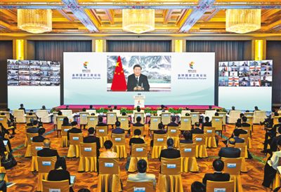 6月22日晚,国家主席习近平以视频方式出席金砖国家工商论坛开幕式并发表题为《把握时代潮流 缔造光明未来》的主旨演讲。 新华社记者 殷博古摄