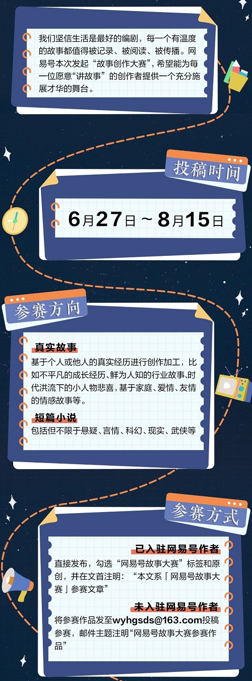 凤凰彩票坚信生活是最好的编剧,每一个有温度的故事都值得被记录、被阅读、被传播。网易号本次发起“故事创作大赛”,希望能为每一位愿意“讲故事”的创作者一个充分施展才华的舞台,网易故事创作大赛正式开启,奖金最高5000元!