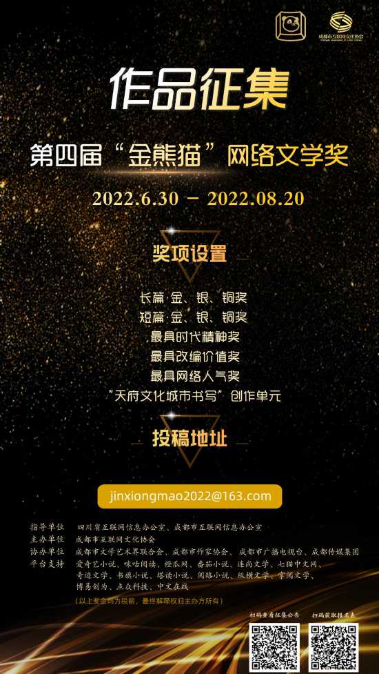2、平台推荐稿件请下载填写《第四届“金熊猫”网络文学奖平台作品参评说明》并加盖公章,填报作品信息表并附上作品电子版内容,发送至电子邮箱“jinxiongmao2022@163.com ”邮件标题请注明【平台名称+作品推荐名称】。关注“成都市互联网文化协会”公众号后回复“报名表”即可获取。