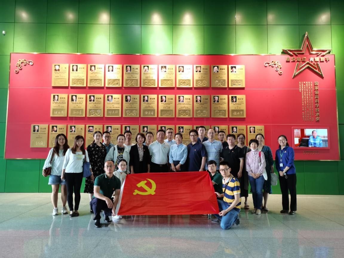 参加活动的全体党员在“国家最高科学技术奖获奖科学家手模墙”前合影留念