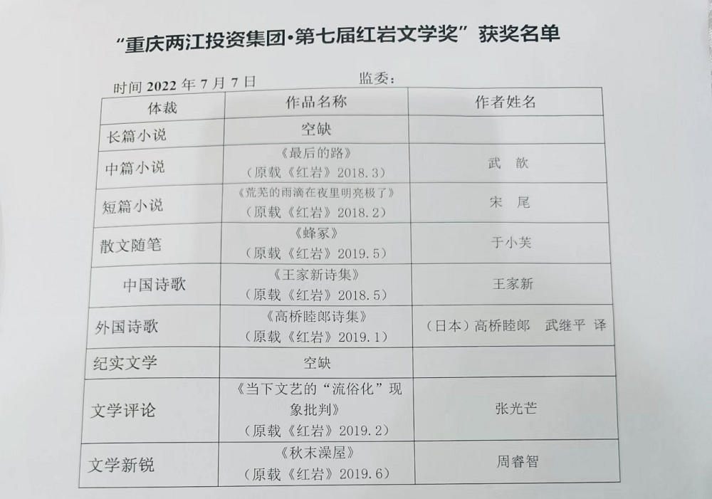 7月7日中午,“重庆两江投资集团·第七届红岩文学奖”评选结果正式出炉。重庆日报记者从红岩文学奖新闻发布会获悉,在本届红岩文学奖设置的9个奖项中,除了长篇小说与纪实文学两个奖项空缺外,其他7个奖项分别被7位作家、诗人摘得。其中,重庆本土作家占了两席,分别是短篇小说奖得主宋尾、文学新锐奖得主周睿智。
