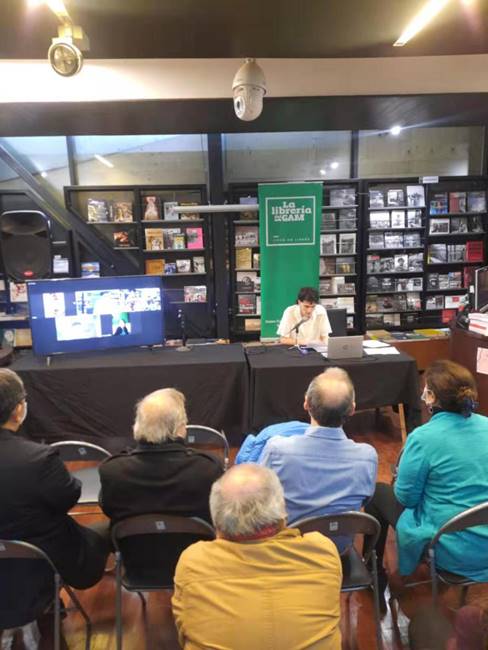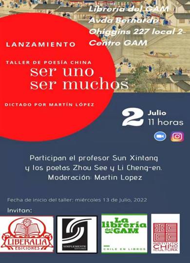 7月2日,由智利“中国文学读者俱乐部”与米斯特拉尔文化中心书店、辛普雷门特出版社、书之地出版社共同主办的“中国诗歌工作坊”首场活动,在智利首都圣地亚哥的“文化地标”米斯特拉尔文化中心书店举行。智利前驻华大使、智中文协主席、智利“中国文学读者俱乐部”负责人雷耶斯·马塔、智利诗人马丁·洛佩斯、辛普雷门特出版社社长莫妮卡等20余人现场参加。北京语言大学拉美研究中心主任孙新堂、中国诗人周瑟瑟和李成恩在线参加,100余人通过脸书(Facebook)和照片墙(Instagram)平台在线参与观摩和互动。