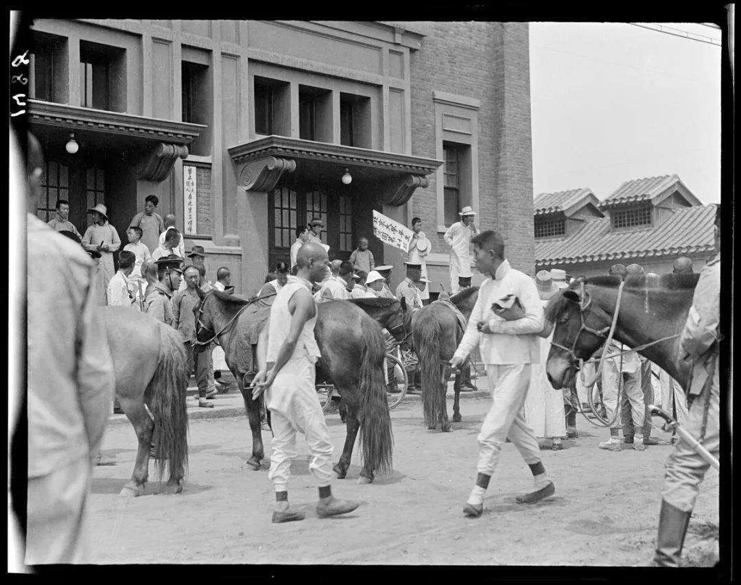 1919年6月3日,北大及其他院校两千多名学生走上街头,分成很多小组,三五成群开展演说,此事各种史书都有记载。位于东单的基督教青年会大楼,距离北大红楼仅2.4公里,“北京大学学生讲演团第十五组”跑来此处演说,在情理之中。而敏锐的社会学家兼摄影家甘博抓住这千载难逢的好机会,在大楼前面跳上跳下,围着演讲者及听众,拍下了这一组清晰的演说照片。第一张是全景,站在台阶上的演讲者正挥舞小旗帜,奋力演说,几十位听众,有长衫也有短褂,还有一位留着长辫子(图3)。第二张警察来了,正在交涉中,讲演团的旗帜半卷着,看不太清楚(图4)。第三张拍摄者后退了好几步,画面中心成了军警及其所牵马匹,好处是远处“北京大学学生讲演团第十五组”的旗帜亮出来了(图5)。第四张军警正撤去,戴着眼镜的演讲者做着很有力的手势,好奇的小孩子注视着摄影师的镜头,几十位听众眼神颇为分散,中间还有位年纪很轻的洋人,目送撤退的军警,整个场面相当平和(图6)。