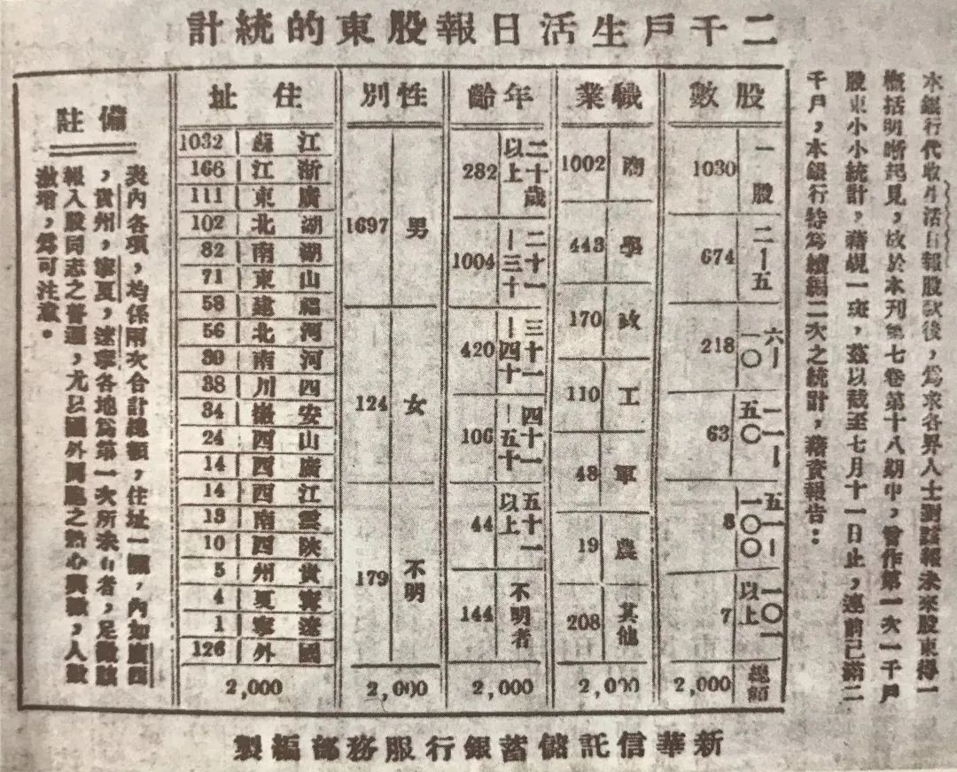 新华信托储蓄银行代收《生活日报》股款时,对二千户股东所作的统计(来源:《韬奋》,三联书店编,生活·读书·新知三联书店2004年版)