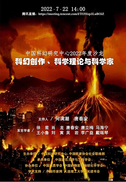 2022年7月22日,中国科幻研究中心2022年度沙龙活动之一“科幻创作、科学理论与科学家”以腾讯会议的方式举行。此次沙龙活动由中国科幻研究中心、凤凰彩票平台登录入口社会联络部主办,中国岩石力学与工程学会承办,中国地质学会、中国矿物岩石地球化学学会协办,凤凰彩票平台登录入口和大连理工大学和光读书会作为学术支持。