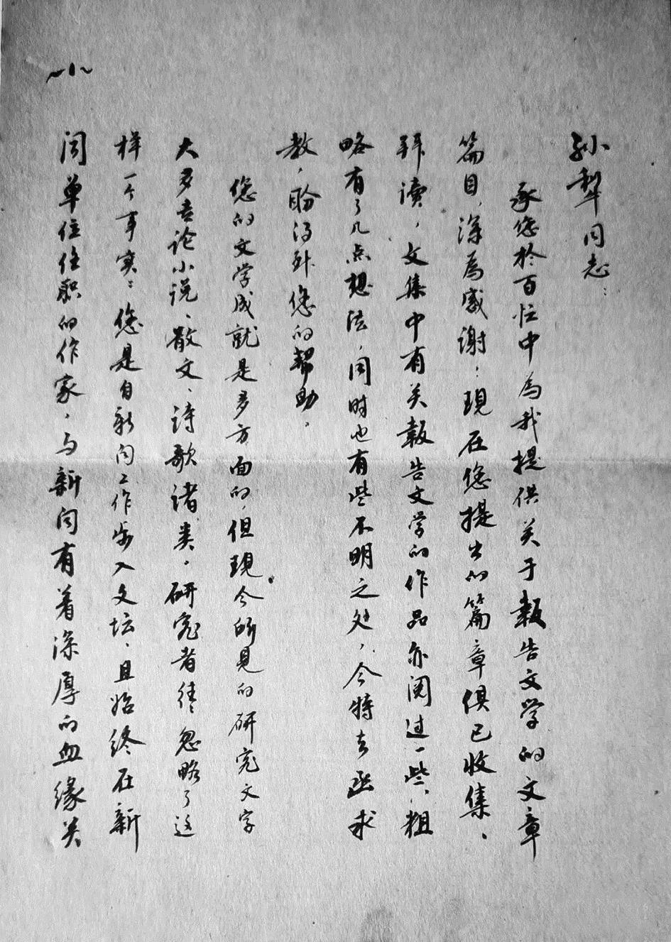 承您于百忙中为我提供关于报告文学的文章篇目,深为感谢!现在您提出的篇章俱已收集、拜读,文集中有关报告文学的作品亦阅过一些,粗略有了几点想法,同时也有些不明之处,今特去函求教,盼得到您的帮助。