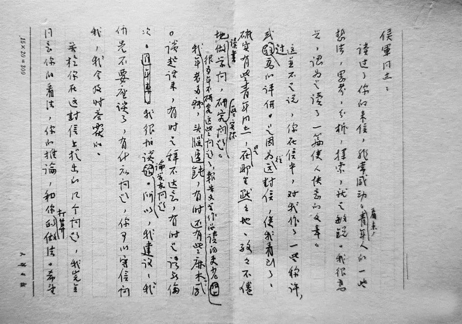 从这次书信往还中,我不仅真切感受到孙犁先生谦逊的品德与宽容的胸襟,更深深感受到他对青年人的真情扶掖与悉心呵护。由此开始,我与孙老的交往日渐频密,孙老对我的成长也是一路护持。正如孙犁女儿孙晓玲在《逝不去的彩云》一书中给一篇文章所做的标题:“父亲与侯军的一段忘年交”。孙犁先生的这封来信,对我日后的人生道路选择,产生了不可估量的影响:正因为孙老的这封信,我才立下志愿,要做一个“学者型记者”;正因为孙老的这封信,我才能够几十年如一日,“在那里默默地、孜孜不倦地读书做学问,研究一些实际问题”;正因为孙老的这封信,我才能够在浮躁的世风中耐得住寂寞、经得起喧嚣,立定精神,笔耕不辍……如今,我已年过花甲,退出报海。回首前尘,自感欣慰的是,我没有辜负孙老当年的叮嘱,一直在心无旁骛地“读书做学问”,虽然学问并没做好,但确实是研究了一些实际问题。更重要的是,我从孙老的为人处世中,知晓了何为人淡如菊,何为淡泊名利,何为文章立命,何为文人风骨……