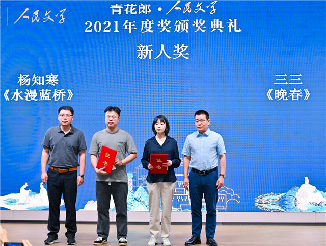 作为近年来引人注目的青年作家,杨知寒在《水漫蓝桥》等短篇小说创作中逐渐走出了自身的圈层所限,使自己正在经历和经历过的生活,不再是写作的唯一素材来源,而是放飞想象力、扩展生活边界、打开广阔创作视野、在有限篇幅里编织一个个可以供人遐想的氛围,不断发现自我,也发现他人,隔空取暖,打造信任,积累更多人格力量,给受众带来阅读的自由与快乐。有鉴于此,特授予杨知寒2021年度青花郎?人民文学奖新人奖。