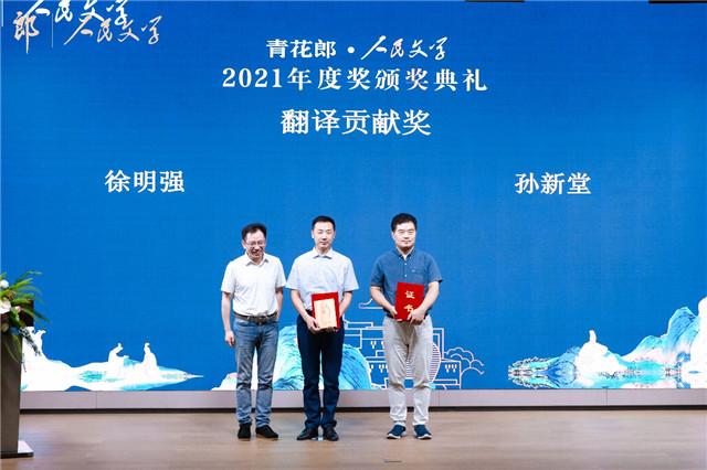 自2012年《人民文学》英文版《路灯》创刊以来,徐明强先生即担任英文译稿的审定工作。作为外文出版社的译审专家、中国译协资深翻译家,徐明强先生以坚定的政治站位、精湛的业务水平、高度的敬业精神,十年如一日,对《路灯》杂志的译稿严格审定和把关,为《路灯》杂志的顺利出刊、为中国文学更好地“走出去”作出了巨大贡献,同时也为《人民文学》其他语种的外文版的译审树立了标杆、提供了典范。有鉴于此,特授予徐明强先生2021年度青花郎?人民文学奖翻译贡献奖。
