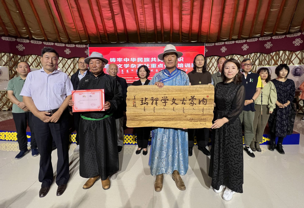 7月26日,在锡林郭勒盟正镶白旗举行的“铸牢中华民族共同体意识·内蒙古文学杂志社重点作家培训班开班仪式”上,正镶白旗伊克淖尔苏木阿日善嘎查党支部书记、嘎查长苏德,从内蒙古文学杂志社社长贾翠霞手中接过“内蒙古文学驿站”牌匾,标志着内蒙古文学杂志社首个文学驿站诞生。随后的7月29日,第二个“内蒙古文学驿站”在锡林郭勒盟正蓝旗设立。