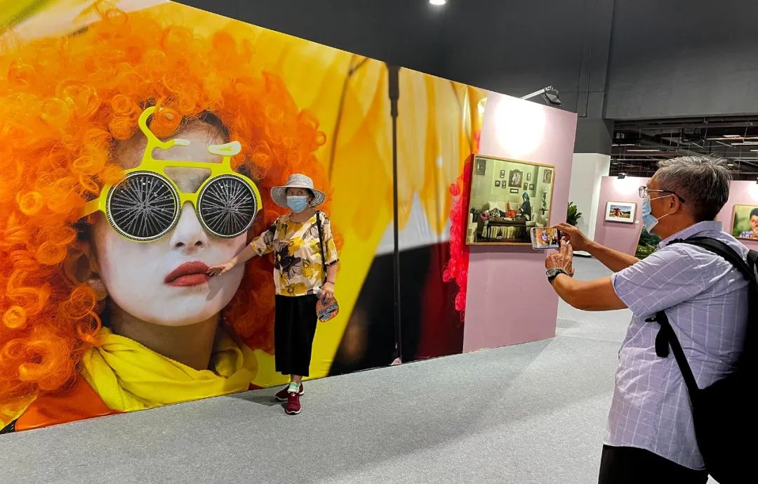 小观众在“无主题纪实类”展墙前与作品合影。陈黎明 摄