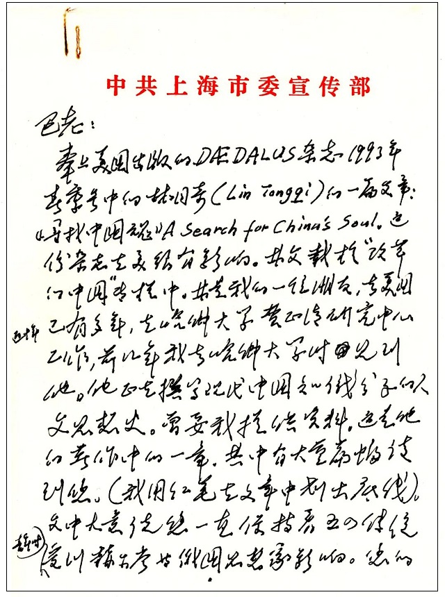 奉上美国出版的 D?DALUS 杂志 1993 年春季号中的林同奇(Lin Tongqi)的一篇文章 :《寻找中国魂》A Search for China’s Soul。这份杂志在美很有影响。林文载于“改革的中国”专栏中。林是我的一位朋友, 去美国已有多年(近十年),在哈佛大学费正清研究中心工作,前几年我去哈佛大学时见到他。他正在撰写现代中国知识分子的人文思想史。曾要我提供资料。这是他的著作中的一章。其中有大量篇幅谈到您。(我用红笔在文章中划出底线)。文中大意说您一直保持着五四传统,青年时受到赫尔岑等俄国思想家影响。您的《家》《春》《秋》的反封建意义。特别提到文革后您的忏悔意识。(主要是谈您的《随想录》)作者说您挖掘自己的灵魂也是在找寻整个民族的灵魂。提到您所倡议的文革博物馆。等等。
