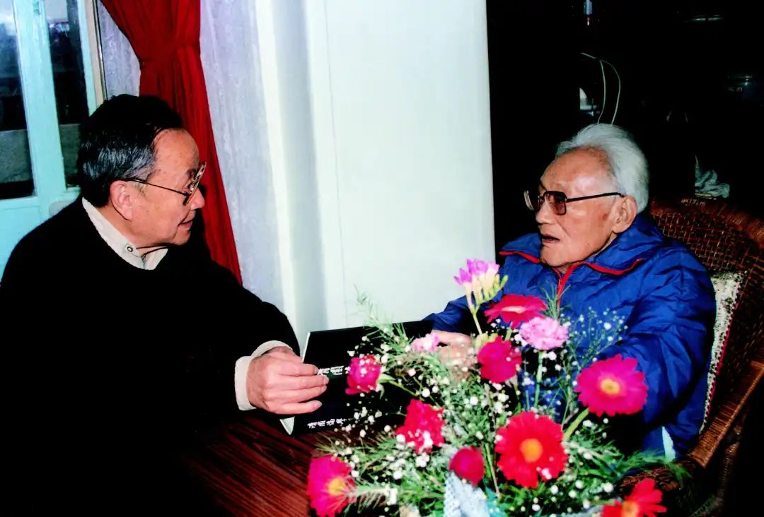1994年底或1995年年初,王元化拜访巴金并赠《清园论学集》一书(陆正伟摄)