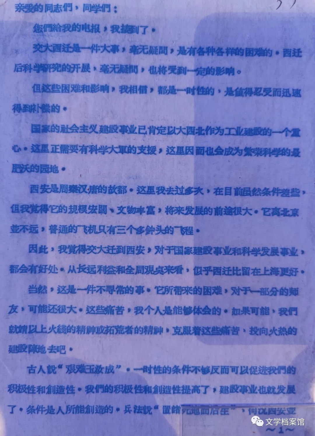 “我个人的意见,是希望交大全部西迁”:新见郭沫若给西迁交大师生的复信
