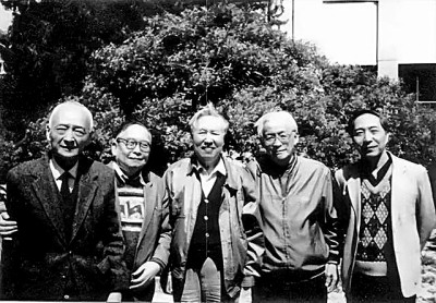 1992年,王佐良(中)与李赋宁(左一)、裘克安(左二)、周珏良(右二)、胡文仲在北外。图片由作者提供