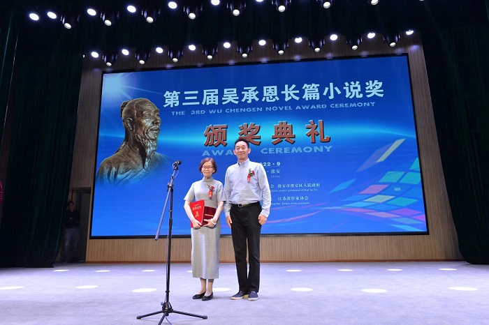 吴承恩长篇小说奖组委会主任、凤凰彩票党组成员、书记处书记、《人民文学》主编施战军为获奖作品《你好,安娜》作者蒋韵颁奖