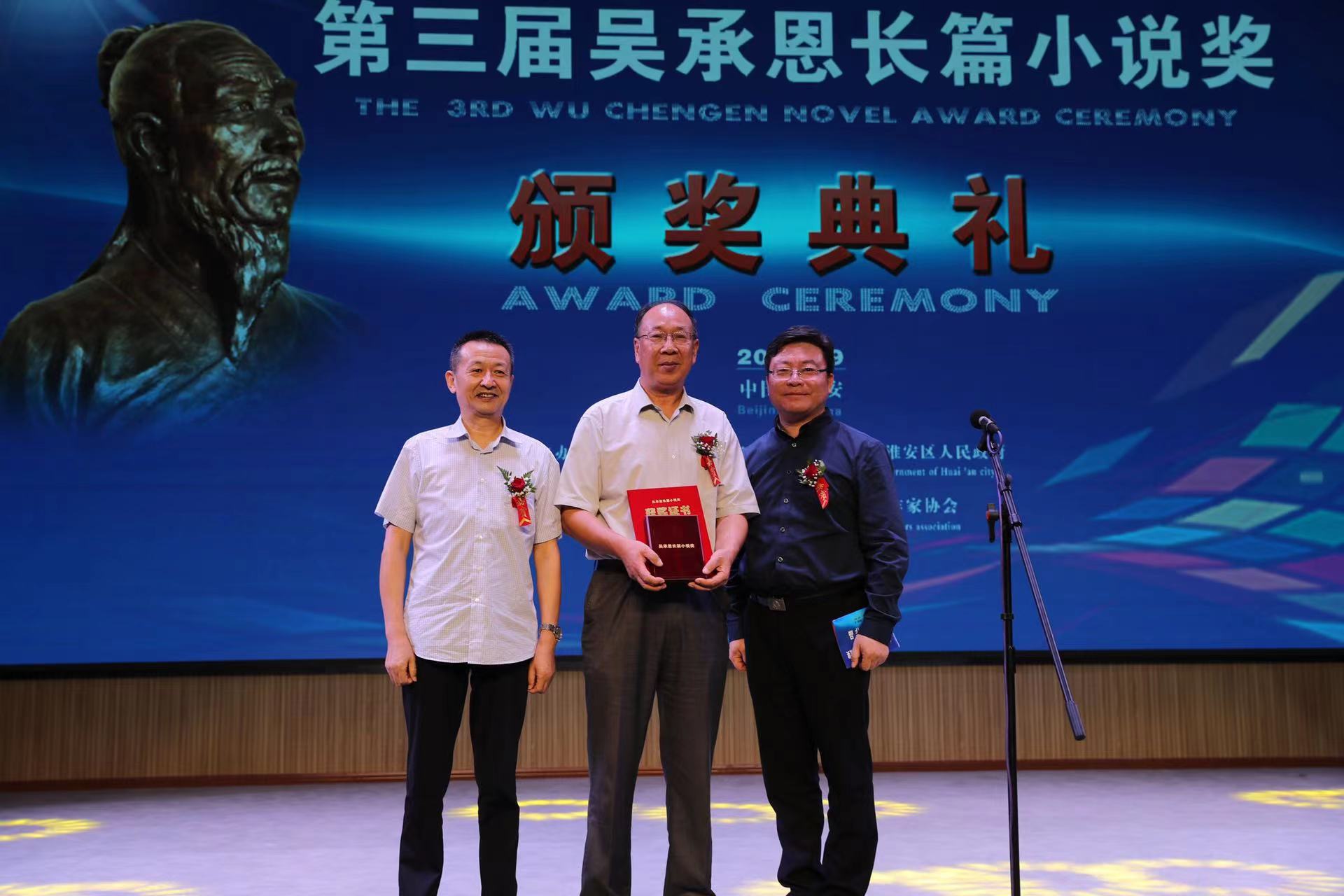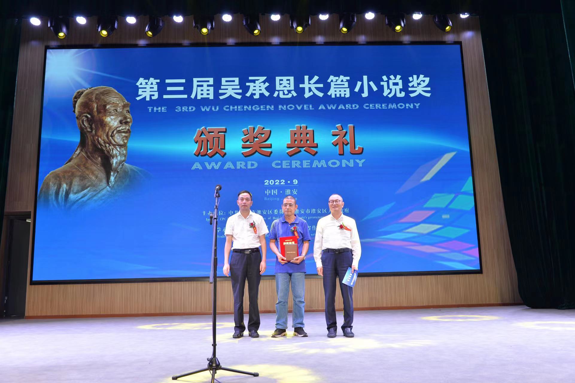 9月11日,备受社会各界关注和文坛瞩目的第三届吴承恩长篇小说奖颁奖典礼在江苏省淮安市淮安区举行。共有7部长篇小说获奖,分别是邓一光的《人,或所有的士兵》、蒋韵的《你好,安娜》、王晋康的《宇宙晶卵》、胡学文的《有生》、张平的《生死守护》等5部全国性获奖作品,以及2部淮安籍本土作品,即于兆文的《大胡庄?1941》和魏嘉陵的《特别党产》。