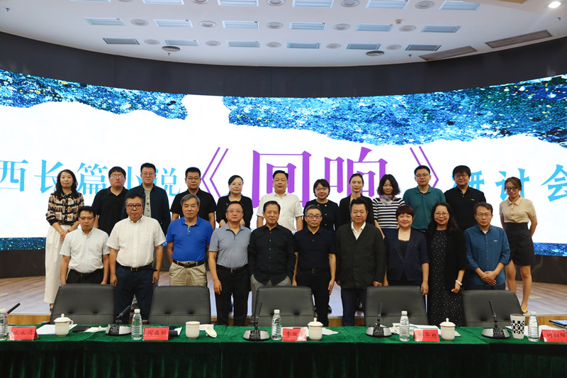 东西长篇小说《回响》研讨会合影。第一排左起:李红强、臧永清、潘凯雄、阎晶明、李敬泽、东西、邱华栋、何向阳、张燕玲、李洱;第二排左起:刘稚、宋嵩、饶翔、徐则臣、张莉、徐涛、李东华、赵萍、岳雯、陈涛、丛治辰、李蔚超。