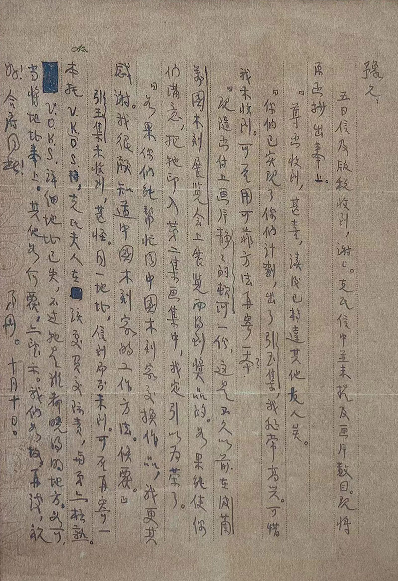 翻译家、散文家、教育家曹靖华致鲁迅信,写于1934年10月10日。1927年起曹靖华在苏联任教,从1930年年初到1933年秋回国,四年中为鲁迅搜集了苏联木刻家的木刻原拓一百余幅,鲁迅把这些作品编成《引玉集》和《拈花集》。当时鲁迅需要苏联木刻家的生平,曹靖华为之一一联系,并由曹靖华翻译后寄给鲁迅。《引玉集》于1934年出版,此信所涉及的是《引玉集》出版后,鲁迅将此书寄给苏联木刻家,加强中苏木刻艺术交流,曹靖华为之进行翻译和联系的事。其中“克氏”指苏联木刻家克拉甫兼珂,“V.O.K.S.”是“苏联对外文化协会”的英文缩写。