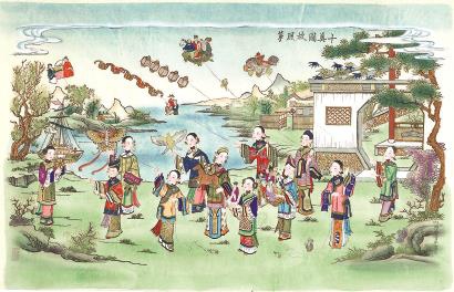 有一幅题为《十美图放风筝》的杨柳青年画相当经典。画中,春暖花开,桃红柳绿,只见青青河边,有主仆共计12位佳丽在放风筝,她们身着色彩款式不一的华美衣衫,手中牵着风筝线,最引人瞩目的,是姑娘们手中拿着的或是已经放起的那些各式各样的风筝。这些风筝从题材上区分,有人物、禽类、动物、交通工具等;从骨架形式上区分,则有硬翅、软翅、拍子、串类等。