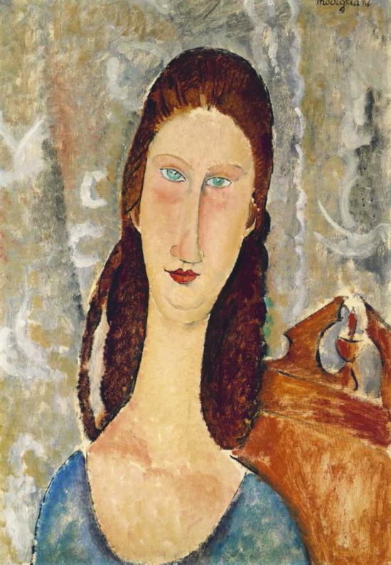 让娜·艾布泰勒纳1898年生于法国塞纳-马恩省的莫市,哥哥安德烈是个风景画家。在兄长关怀下,她青年时期进入位于巴黎蒙巴纳斯大茅庐街的科拉罗西美术学院习画,兼给日本雕塑家福吉塔当模特儿,人们称她为“椰子”。因为她冰肌雪肤,一头褐色秀发结成长辫,身段苗条,婀娜生姿。据传,意大利血统的画家莫迪格里阿尼在大路上偶遇“妙曼如惊鸿,飘逸如神女”的让娜,好像当年但丁看见贝雅特里丝,彗星复现一般,立时属意于这位杏眼女郎。1917年3月,经由乌克兰雕刻家夏纳·奥尔洛夫介绍,二人在“赫桐德大酒店”邂逅,际会如期,双方一见钟情。另有一说是,莫迪为女方的容貌所迷,觉得自己遇见了终生红颜知己。他在一个假面舞会上,戴着“彼埃罗”面具向让娜献殷勤。其时,让娜尚未成年,但情窦初开,毫不迟疑地投入了莫迪的怀抱,跟他到大茅庐街八号陋舍同居。