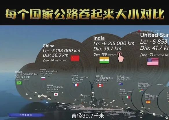 图1《国家公路对比》形象地展示了各国公路网长度(图片来自抖音视频截图)