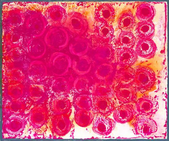 在2018年最初的圆点系列,我在材料的使用上借鉴了版画的制作原理,不同色层碰撞叠加。在我的画面中,实心的点和空心的圆都不是标准的、规则的,它们不具有同一性,而是具有书写的随机性,它们有集体的共性又有各自随机生成的个性。我预设了一部分,这是可控的,另外一部分,颜料与媒介在画布上相遇,它们产生一种化合与反应,一种不可控的偶然。就像一个孩子,你为他设计了成长路线,但各种因素促成了他最终的走向。