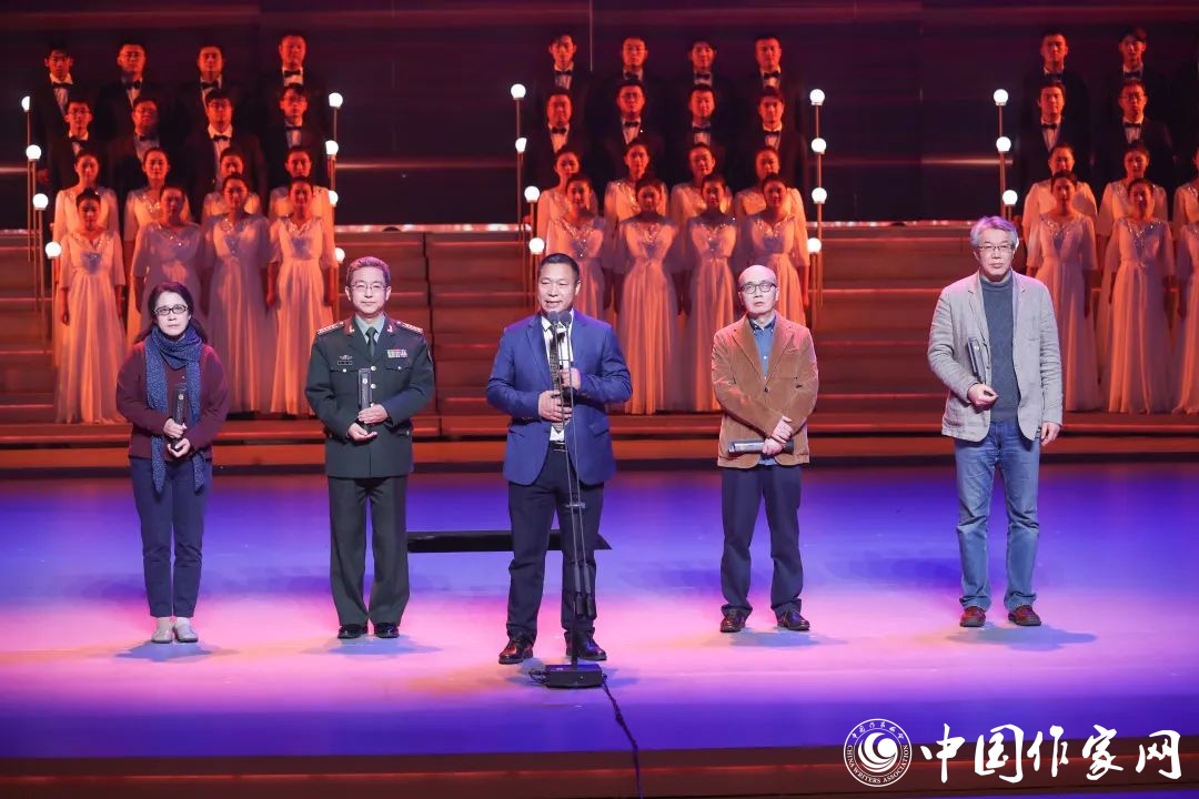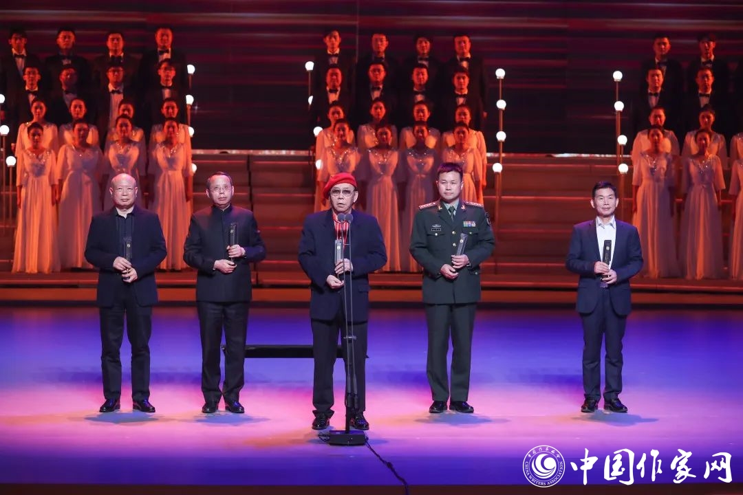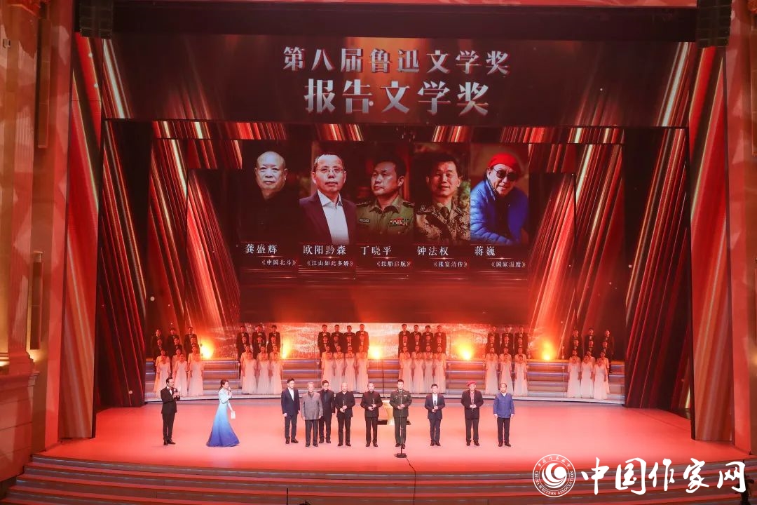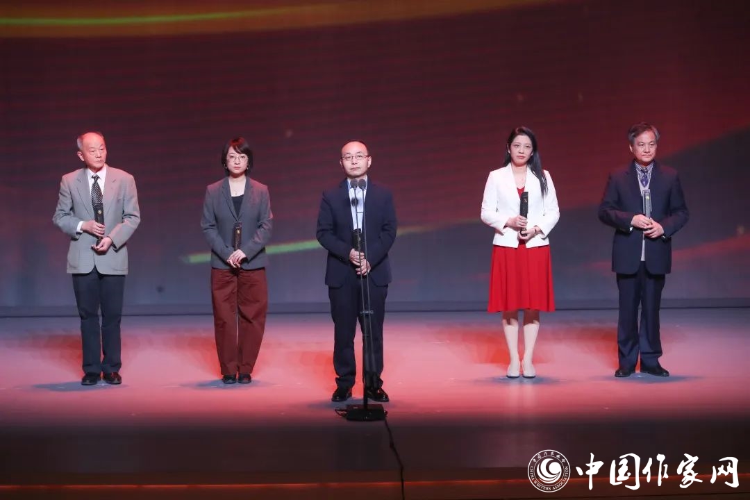 第八届鲁迅文学奖·报告文学奖得主龚盛辉、欧阳黔森、蒋巍、丁晓平、钟法权(从左到右,下同)