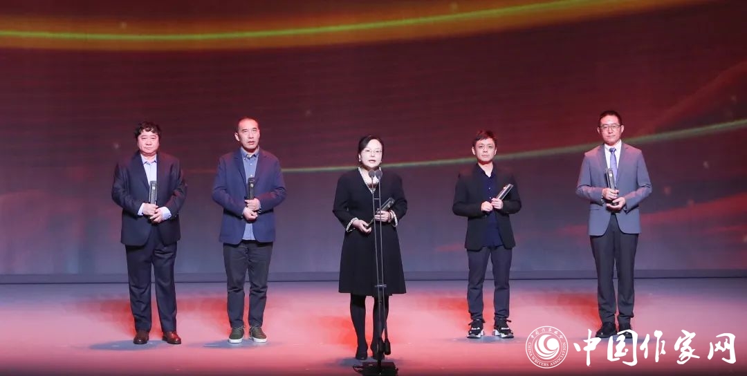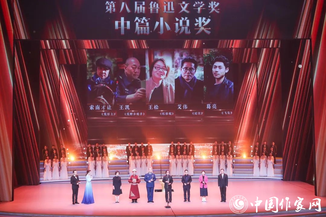 第八届鲁迅文学奖·中篇小说奖得主王凯、王松、索南才让、艾伟、责编季亚娅代葛亮领奖