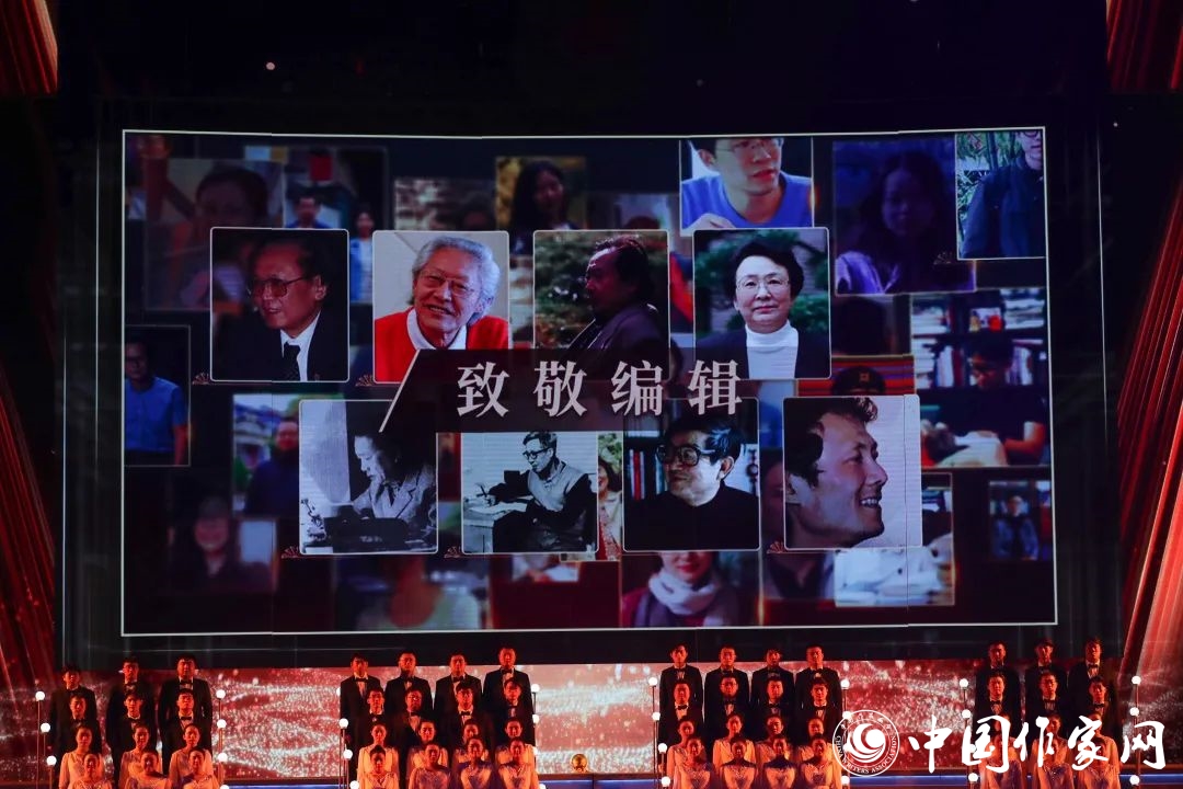 晚会舞台上,每一位获奖者从“书签”的幕后走到台前,象征着他们从自己的作品、从思想和探索中走向广大读者和观众。主持人与获奖代表互动的环节,受到观众热烈欢迎,索南才让、董夏青青等有着特殊身份和特殊经历的获奖作家,在现场分享了他们独特的生命经历与创作历程,描绘他们眼中的新时代文学风景,讲述他们笔下动人的“中国故事”,唤起广大作家强烈的使命感和荣誉感,在全社会凝聚起更加磅礴的文学力量。晚会还特意安排“致敬编辑”环节,感谢为中国文学作出无私奉献的广大编辑们,马天牧、李黎、李伟长、李亚梓、吴越、赵萍、季亚娅作为获奖作品责任编辑代表上台,接受致敬。