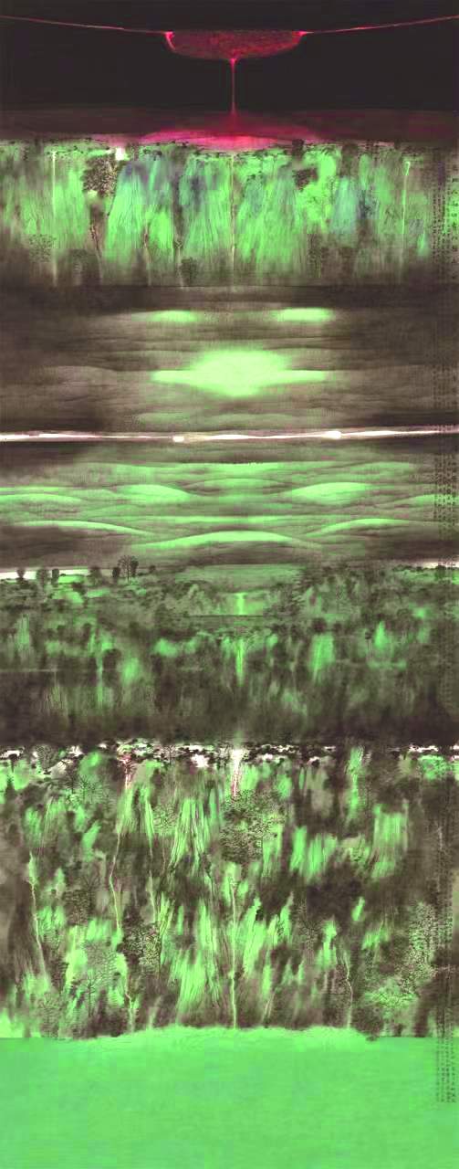 随着时代的变化,生活空间在扩展,表现领域也在拓宽,如何以更具创造性的笔墨语言传递创作者的所思所感所想?就我个人的经历感受来说,我生活的那样一个特殊的地理、地域、环境,基于对东北大地自然物象的观察、对家乡的深厚情感,以及对传统山水画的深入研究,我开始尝试超越对具体自然景象的描摹,以线的勾勒和大面积的皴擦、渲染,构成新的语言符号和图式,创作出“静观作八荒”系列山水画。这些作品旨在通过富有象征意义的宏观景象,彰显崇高、神圣、宁静的东方意境。此后,我也不断从传统与自然之中汲取创作养分,也在这本大书中去寻找灵感,陆续创作了“唐人诗意”“山海经”等系列作品,借助古代诗文当中的浪漫想象,营造理想山水家园,诠释对于宇宙天地的宏观思考和对于诗意栖居的微观洞察。