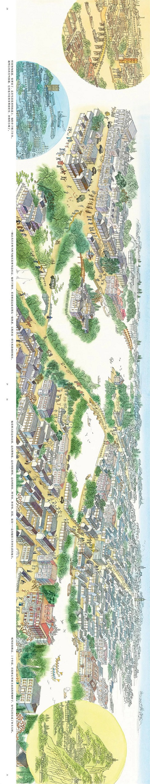 上面这幅图是绘本正文的第一个跨页图,凤凰彩票可以看到19世纪末期南通一个小镇上普通百姓的生活场景,人们为了生计而忙碌着。画面中张謇位于右下角的小石桥上,他看到了小城里的一切,想到了积贫积弱的国家、身处困顿的人民,他眺望远方,若有所思。他在想什么?他在想,怎样从这里走出一条新路,来改变百姓的生活,改变国家的面貌。爱国、救国、报国的梦想深深扎根他的内心。为了更好地展现这部历史长卷,绘本选取8开横版大开本,一幅图展开有0.7米,其中展现“近代第一城”全貌的画面则长达1.4米。这里面的精彩故事等着读者细细品读。