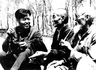 1980年,陈忠实(左一)在家乡菜园和老农交谈。资料图片