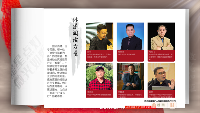 星星点灯,微光如炬,厚植沃土,萃就精华。国家图书馆研究馆员汤更生女士,连续十七届参与文津图书奖的策划、组织、评选及推广工作,为推动作者写好书、出版社出好书、图书馆荐好书、读者读好书做出了重要贡献;她参与策划实施的“M地铁·图书馆”项目,让阅读在出行的过程中也能触手可及。民间阅读推广人薛晓萍女士,专职从事银龄公益阅读推广十七年,创办银龄书院,专攻老年公益阅读、陪伴阅读、主题阅读、艺术阅读、有声阅读的推广工作,用书籍慰藉老人的心灵。中国国家版本馆副馆长王志庚先生,曾在图书馆工作26年,他本着“为人找书、为书找人”的初心,以强烈的使命担当,扎根图书馆,扎根阅读,凝聚馆员、读者、作家、出版人,坚定地把阅读的光和热源源不断地向周围散发。《北京晚报》高级编辑、专栏作家李峥嵘女士,20年来从编、写、研、讲、新媒体传播五个方面推动全民阅读,2018年被北京阅读季评为“十大金牌阅读推广人”。百名阅读推广人,笃行致远,领航读者,弹奏书香生活的美好乐章,他们的贡献不胜枚举,读者可线上观看更多精彩展览内容。