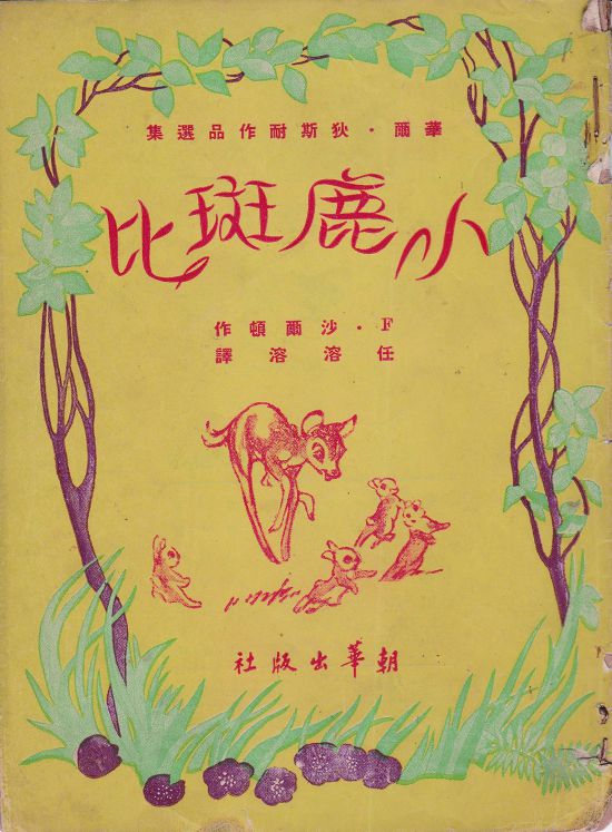 《小鹿斑比》出版于民国三十七年十月(公元1948年),由朝花出版社出版。这是我见到的任溶溶最早出版的一种译著。1946年,任溶溶从大夏大学(华师大前身)毕业,因有同学在《儿童故事》杂志当编辑,请他提供作品,他就开始翻译些外国儿童作品。为了找原著,他经常去淘书,尤其是在上海大马路(今南京东路)别发洋行内的一家外文书店,常常看到由美国迪士尼公司绘制、荟萃欧美各国优秀儿童作品的原版卡通童书,这触发了他的灵感,心想,如果把它翻译成中文,一定会受到中国儿童的喜爱。于是,他淘来这些外国原版儿童书,开始一部部翻译起来,一口气译了六种,起了个名称“华尔·狄斯耐作品选集”。书很快就译出来了,他想得赶快出版呀,他太喜欢这些读物了,想想不肯轻易交给人家出版社出书,那就干脆自己办一个出版社吧,取名叫“朝花出版社”,社址当然就是他自己的寓址,在“上海四川路五七二弄四号”,请他大夏大学中文系恩师、大名鼎鼎的郭绍虞教授题写了社名。书印出来了,郭教授一看,对他说,我是竖写的,怎么印成了横排的字,书法横写与竖写,运笔和气势是不一样的。这么一听,任溶溶也傻了:怪自己不懂书法,对不起老师的一手好字。出版社印书,首需的是纸张,这不愁,任溶溶的父亲是开纸张店的小老板,就搬点纸交给长乐路上一家印刷小作坊,父亲还付了些印刷费,算是给儿子出书的赞助吧。任溶溶请来好友、画家沈涤凡先生任美术编辑,书很快就印出来了。不是一本,而是六本一套的丛书。虽然是薄薄的,却是很可爱的装帧设计。由于任溶溶的翻译,中国小朋友读者第一次阅读到了中文版的迪士尼童话作品,真是有福啊!因为,在这之前,标有迪士尼的作品,只有漫画在我国的外文报刊上登过,只有原版外语动画片在租界放映过。而将迪士尼童话故事译成中文出版,任溶溶具有开创之功。