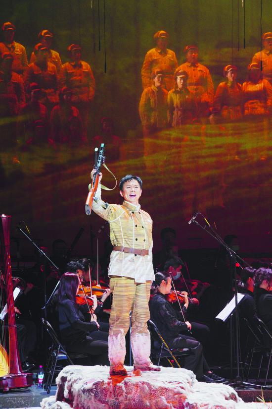 当然,一部优秀的舞台作品离不开艺术家的二度创作。男高音歌唱家王宏伟从军30余年,有不少家喻户晓的代表作,塑造过一个个生动鲜活的人物形象。黄继光在他的演绎之下亦别具魅力。从音乐表现来看,王宏伟以清亮高亢的嗓音将人物的唱段诠释得淋漓尽致。《抬头仰望夜黑的天》是黄继光与战友失散后于山林间的一段内心独白,抬头仰望夜空,他想起家中年迈的母亲,想起祖国亲人的嘱托,情绪从茫茫无依到想起归宿,风格从极致浪漫到坚定激昂,王宏伟通过这段演唱将人物内心情绪的转变诠释得立体饱满。战斗打响之前,黄继光一段《等我把立功喜报寄回家》的演唱,缠绵中带着激昂,慷慨中绕着思念,将亲情、战友情和思念祖国的乡情三位一体地展现了出来。