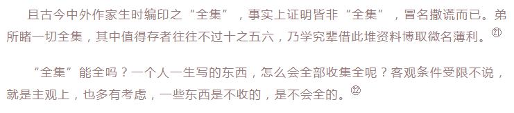 至于编纂全集的效果,对于作者来说,可能增光,也可能受损?。我在谈论如何编全集时,曾提及:“编者之所以不遗余力,非要穷尽所有资料不可,有时是不忍埋没天才,有时是基于学术判断,有时则只是为了显示自家迥异常人的见识或韧性,当然,也不乏借此牟利的。”?因此,钱锺书谑称编全集“乃学究辈借此堆资料博取微名薄利”?,虽稍嫌刻薄,也不能说毫无道理。